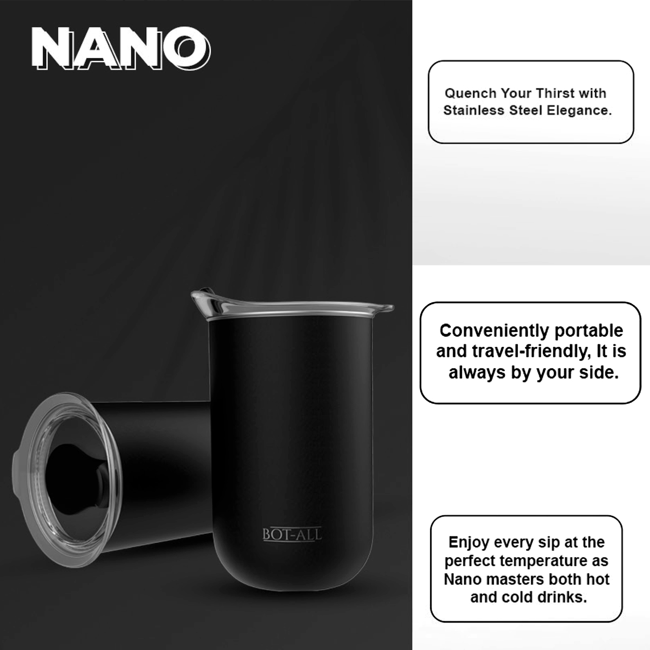 Generous Capacity: With a generous capacity of 300ml, the Nano bottle offers ample space to hold your favourite drinks. Whether it’s refreshing cold beverages or comforting hot drinks, this versatile bottle has got you covered.