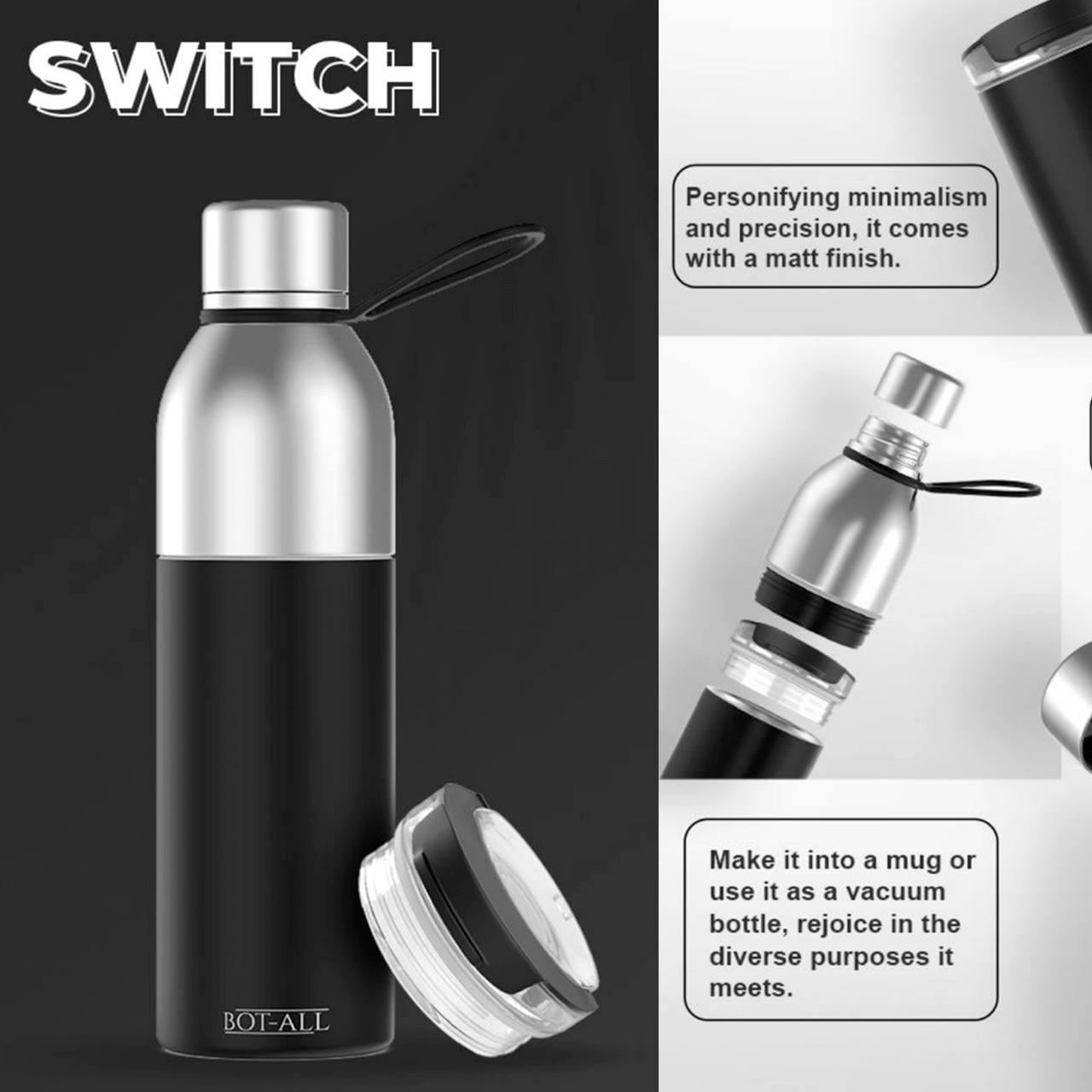 MULTI-FUNCTIONAL DESIGN: The BOT-ALL Switch comes with a unique design crafted to cater to all the needs of the customer. The SWITCH can be used as both a bottle & a tumbler for Kids, school, office, sports & gym. It can carry your water when you’re working & Carry your drinks, smoothies, Protein shakes while you’re on the go or at the gym.