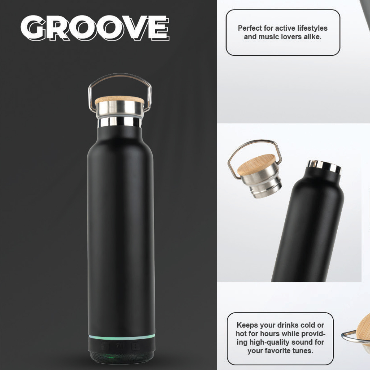 BOT-All Groov White Premium Stainless Steel Bottle with Bamboo Lid – 600ml, Eco-Friendly & Rust-Resistant, 10-Hour Temperature Retention, with 5W Detachable Bluetooth Speaker